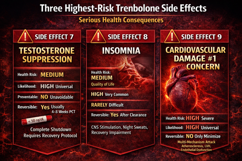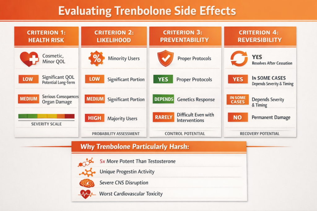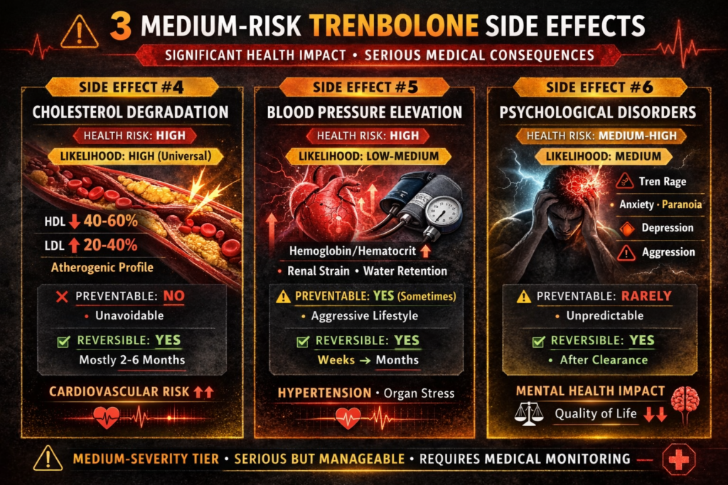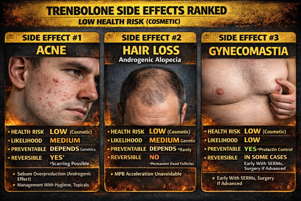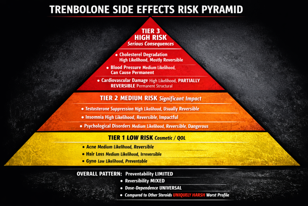 Much of this is dangerously optimistic. The truth: Trenbolone causes side effects that range from cosmetic annoyances (acne, hair loss) to serious health threats (cardiovascular damage, severe insomnia, psychological disorders). Some effects are preventable or reversible. Many are not. Genetics, dosage, and duration influence severity, but trenbolone is harsher than most steroids regardless. Understanding each side effect likelihood, preventability, reversibility, and health risk is essential before first injection.