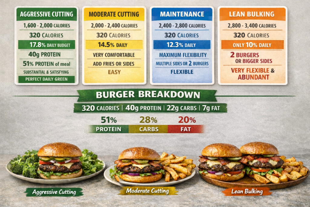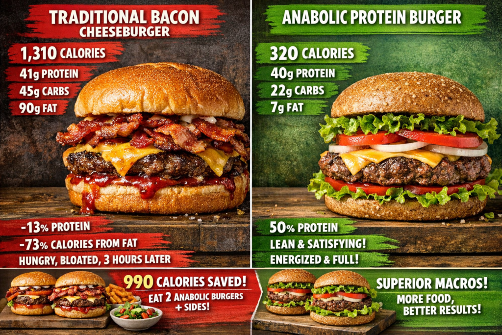 You’re craving a massive, juicy burger but you’re cutting and your macro budget is tight. Traditional restaurant burgers are calorie bombs: a typical bacon cheeseburger with bun delivers 1,200+ calories, 65g fat, and maybe 35g protein if you’re lucky. So you eat another bland chicken breast with rice, dream about burgers, and feel miserable.