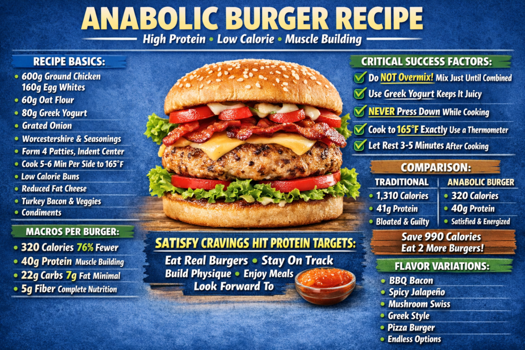 What if you could have a legitimately satisfying burger that actually fits your macros and supports muscle building? This anabolic protein burger recipe delivers 40g protein, only 320 calories per complete burger with bun, and tastes like a real restaurant quality burger, not a dry hockey puck pretending to be meat. Unlike traditional burgers loaded with fatty beef and calorie dense toppings, this high protein version uses strategic ingredient choices to create juicy, flavorful patties while multiplying protein and slashing unnecessary calories.