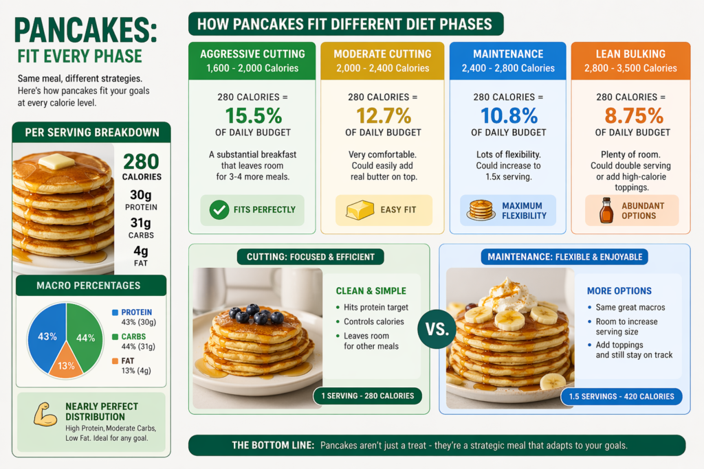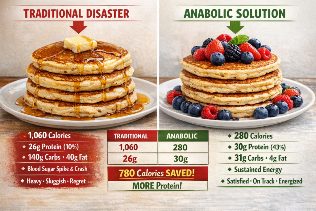 You wake up on Saturday morning craving a stack of fluffy pancakes dripping with syrup, but you’re deep in a cut and your calorie budget is tight. Traditional pancakes are a disaster for your macros, a typical stack delivers 600+ calories with barely 10g protein, leaving you hungry an hour later and way over your carb budget.