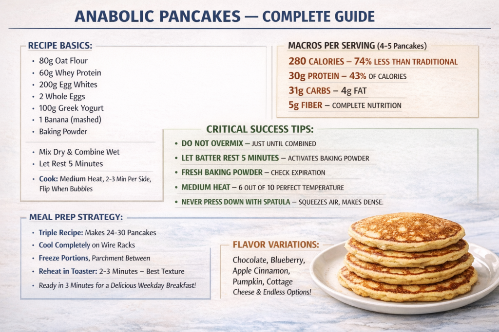 In this comprehensive guide, I’ll show you exactly how to make perfectly fluffy anabolic protein pancakes, the specific ingredients and why each one matters for texture and macros, step-by-step instructions for restaurant quality results every time, multiple topping strategies that keep calories reasonable, macro breakdowns and how this fits cutting vs bulking phases, and meal prep methods to have pancakes ready all week.