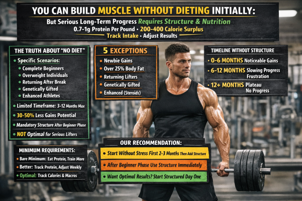YOU CAN BUILD MUSCLE WITHOUT DIETING INITIALLY. BUT FOR SERIOUS LONG-TERM PROGRESS, STRUCTURE NUTRITION: 0.7-1G PROTEIN PER POUND, 200-400 CALORIE SURPLUS, TRACK INTAKE, ADJUST BASED ON RESULTS.