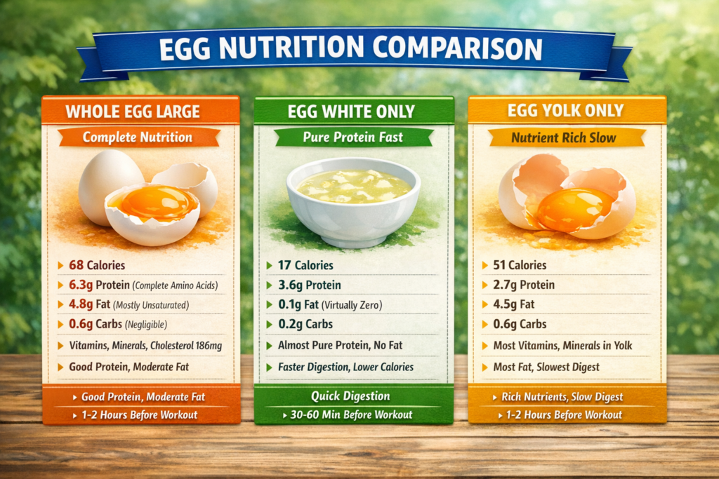 - Egg whites: Less fat, faster digestion, fewer calories