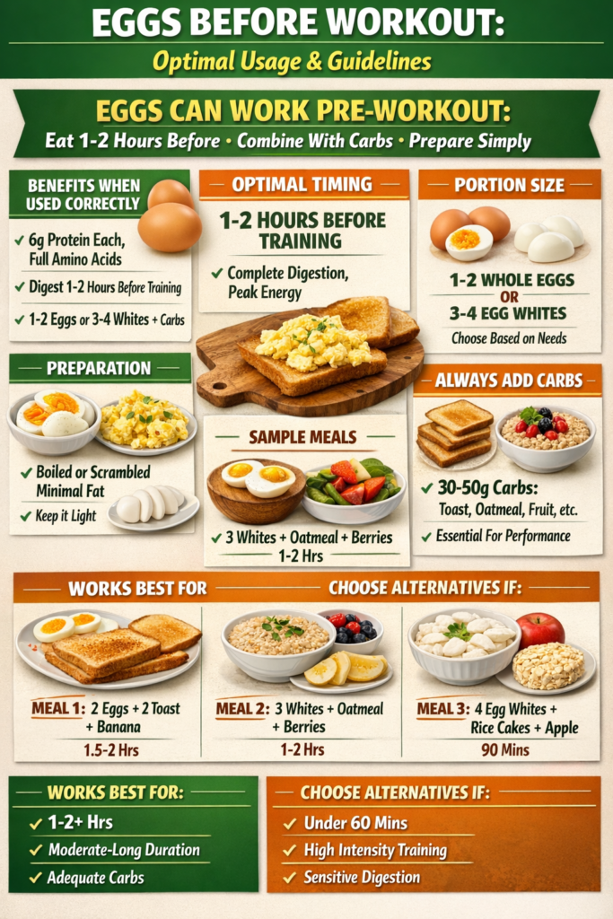 The verdict: Eggs are a good protein source but incomplete as a standalone pre-workout meal. They work best when combined with carbohydrate sources.