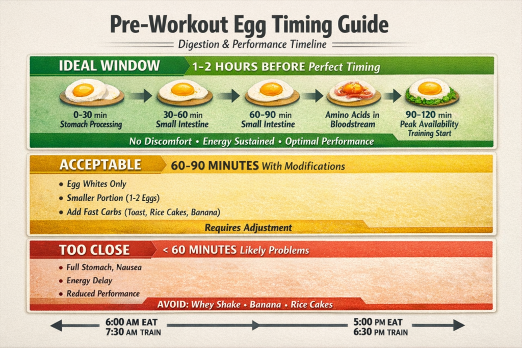 Here’s the evidence-based truth: Yes, you can eat eggs before a workout, and they provide high-quality protein (6g per egg) and sustained energy. However, the fat content in yolks (5g per whole egg) slows digestion, which can cause fullness or discomfort if eaten too close to training or in large quantities. The ideal approach is 1-2 whole eggs or 3-4 egg whites eaten 1-2 hours before training, preferably combined with carbohydrates for optimal performance.