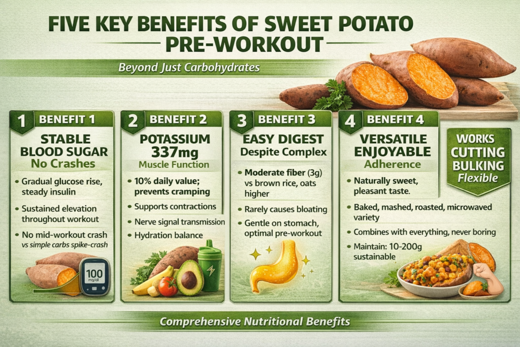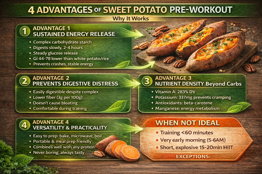 Here’s the straightforward answer: Yes, sweet potato is an excellent pre-workout food when eaten 1-2 hours before training. It provides 35-40g of complex carbohydrates from a 150-200g serving, delivers sustained energy throughout your workout, has a low glycemic index that prevents blood sugar crashes, and combines well with protein sources for complete pre-workout nutrition.