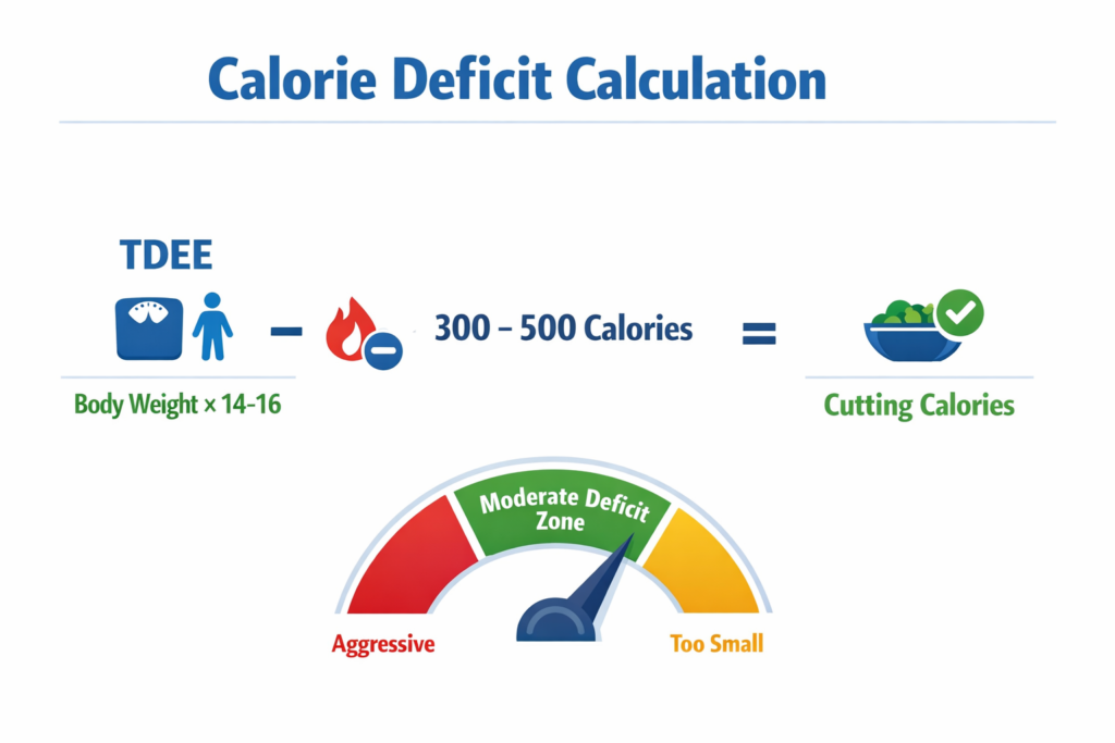 For optimal fat loss while preserving muscle, create a moderate deficit of 300-500 calories below maintenance.