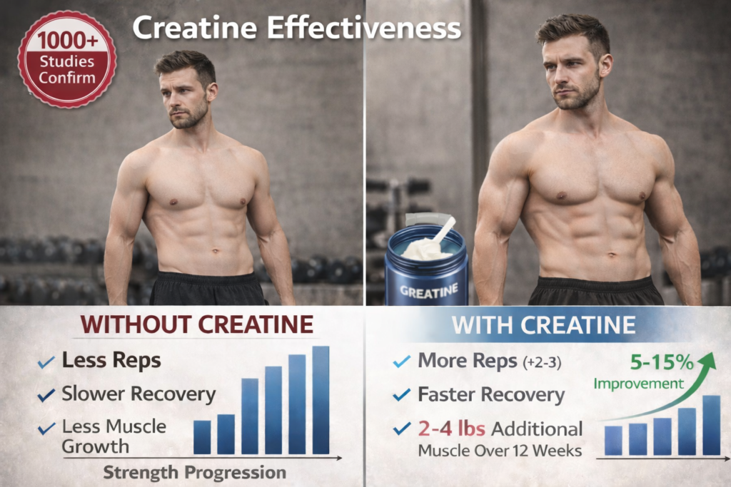Important distinction: Creatine doesn’t directly build muscle. It enhances your ability to train harder, and that increased training stimulus builds muscle.