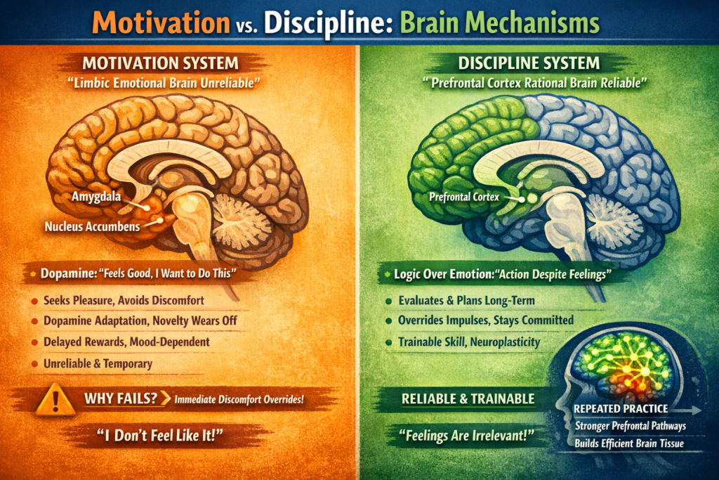 Here’s what’s actually happening: Motivation is an emotion. Emotions are temporary and unreliable. Your brain’s limbic system (emotional center) is designed to seek immediate pleasure and avoid discomfort. Waiting for motivation means waiting for your emotional brain to approve of hard work which it never will. Discipline is the prefrontal cortex (rational brain) overriding the limbic system. It’s a skill you build through repeated action despite how you feel. The neuroscience is clear: people who rely on discipline have fundamentally different neural pathways than those who rely on motivation.