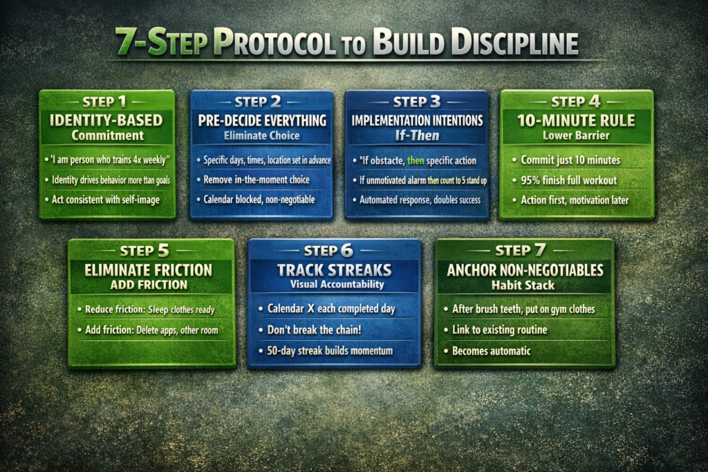 Ready to build a complete discipline and habit formation system with neuroscience-based protocols, environmental design strategies, identity transformation techniques, and accountability structures that guarantee consistent action regardless of motivation levels? Understanding discipline is just the beginning. Get a comprehensive guide to building unshakeable consistency, automating desired behaviors, developing bulletproof self-control, and achieving any goal through systematic discipline development. Stop relying on feelings. Start building discipline.