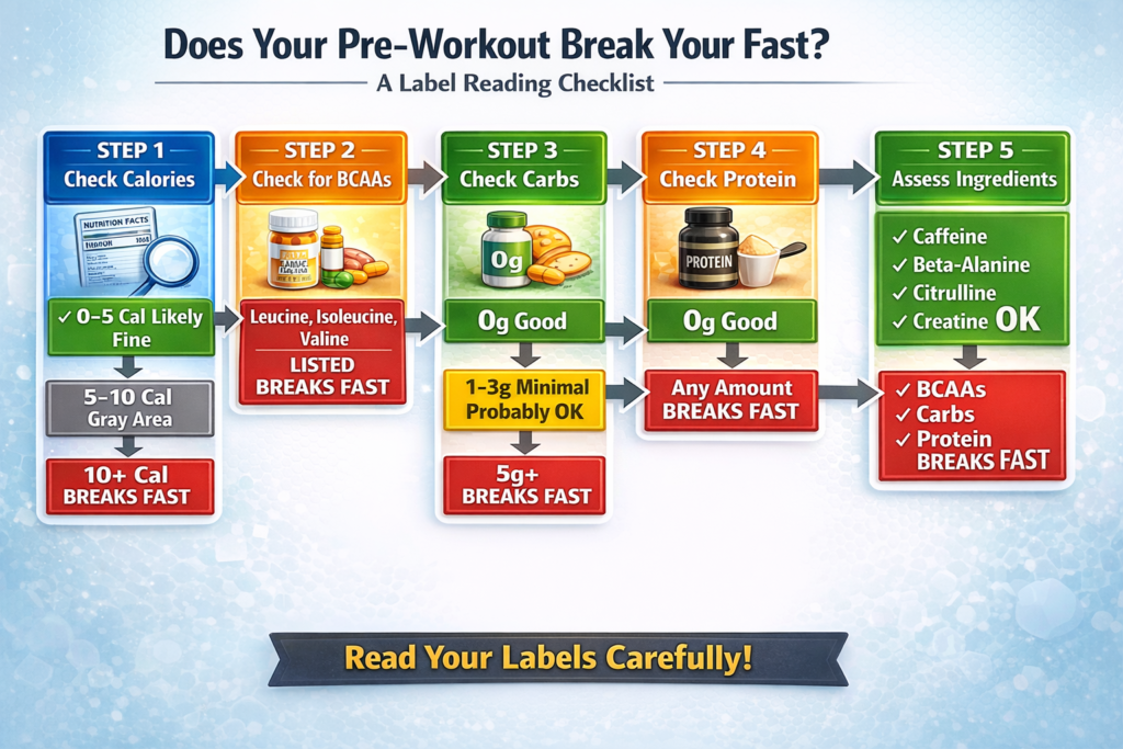 CHECK YOUR PRE-WORKOUT LABEL. NO BCAAS, NO CARBS, 0-5 CALORIES = FASTING-COMPATIBLE. BCAAS OR CARBS = BREAKS FAST. CAFFEINE, BETA-ALANINE, CITRULLINE ARE SAFE.