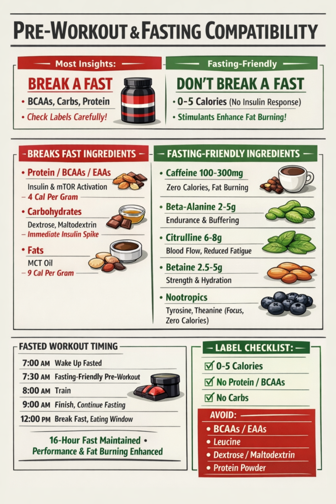 For our purposes (fitness-focused fasting combined with training), we’ll primarily focus on whether pre-workout ingredients significantly disrupt fat burning, raise insulin, or provide meaningful calories that would negate the metabolic benefits of fasting.
