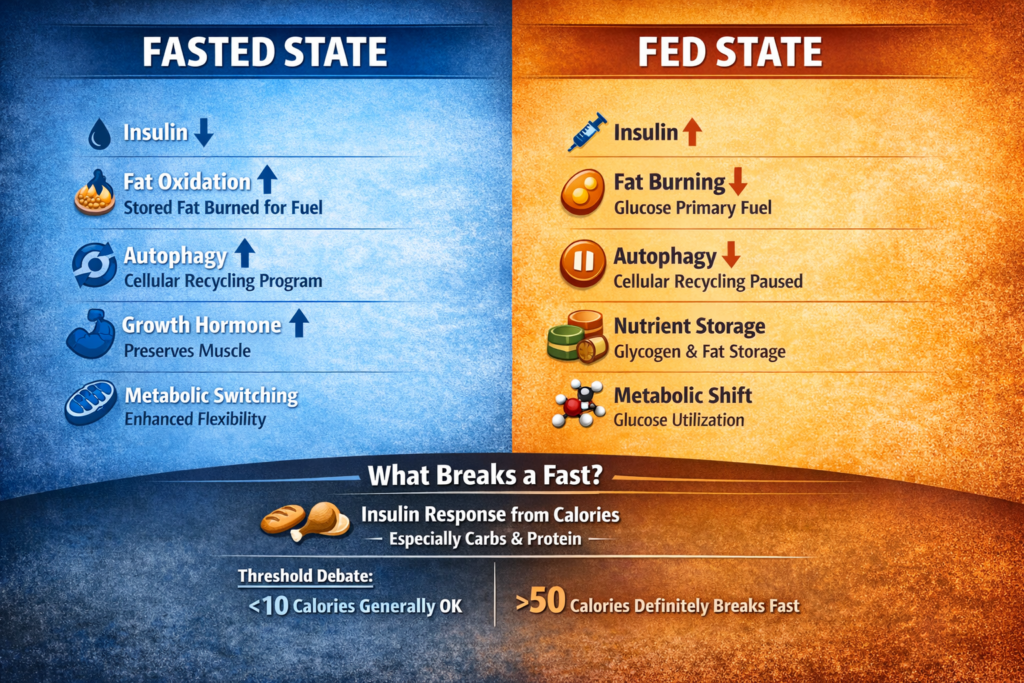 Your body isn’t just “waiting around” when you’re fasting. Specific metabolic changes occur that differentiate the fasted state from the fed state: