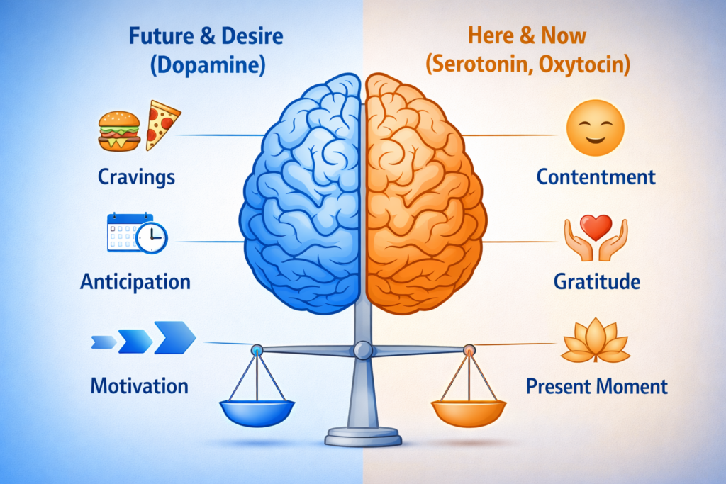 The key is balancing future-oriented neurotransmitters with present-focused ones. Ancient practices like gratitude help us appreciate what we have, counterbalancing the desire for what we lack.