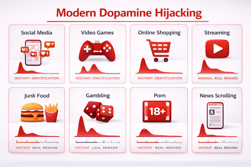 Welcome to the dopamine hijacking of modern life. We’re surrounded by an endless parade of instant gratification that leaves us perpetually unsatisfied, unable to focus, and constantly chasing the next hit of stimulation.
