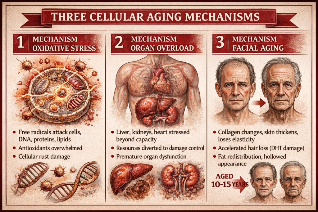 In this comprehensive guide, I’ll explain the cellular mechanisms of steroid-induced aging (oxidative stress, telomere damage, organ stress), reveal the visible signs (facial changes, hair loss, cardiovascular aging), show you the brain impact (cognitive decline and atrophy), provide harm reduction strategies (if you insist on using), address TRT vs. abuse (the critical dose difference), and answer common questions (reversibility, genetics, safer protocols).