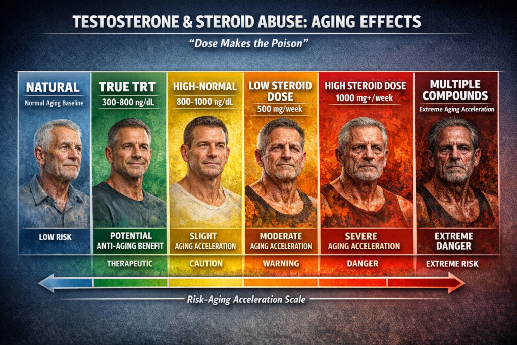 - Steroid abuse (2000-5000+ ng/dL): Severe aging