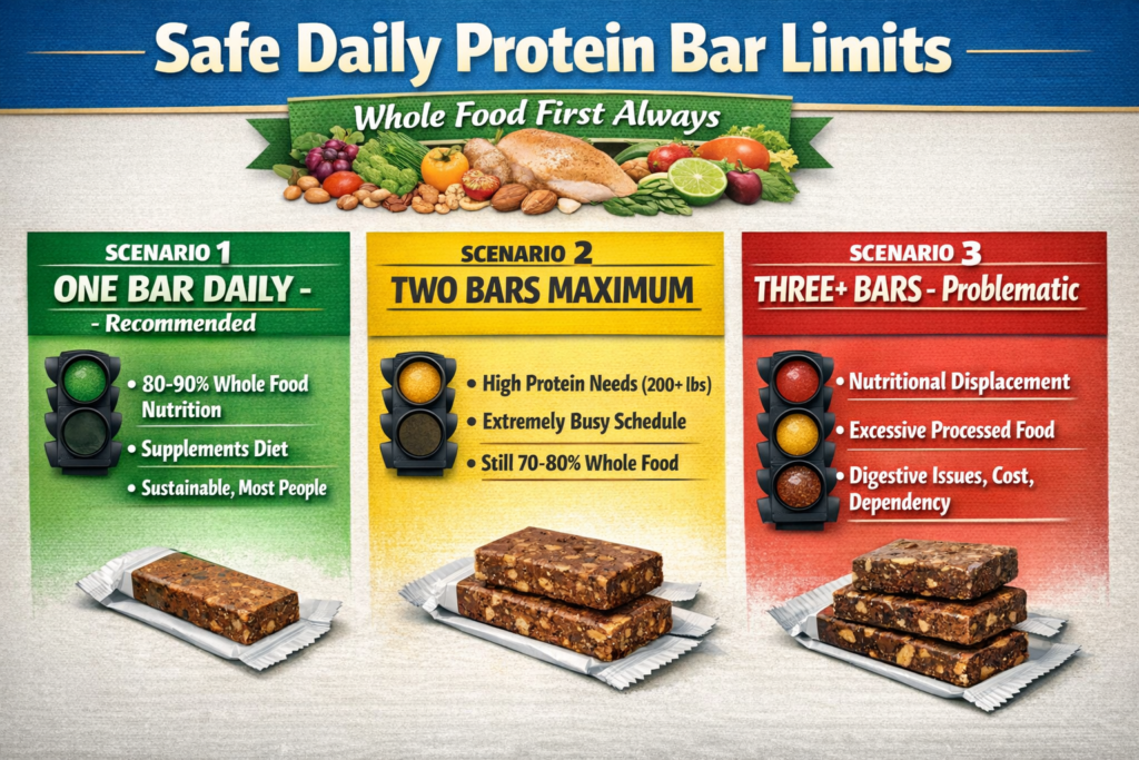 Here’s the straightforward truth: For most people, one protein bar daily is the safe, practical recommendation (maximum two). This helps supplement your protein intake without displacing whole foods that provide essential nutrients protein bars lack. Eating more than two daily typically means you’re replacing too much whole food nutrition with processed supplements.