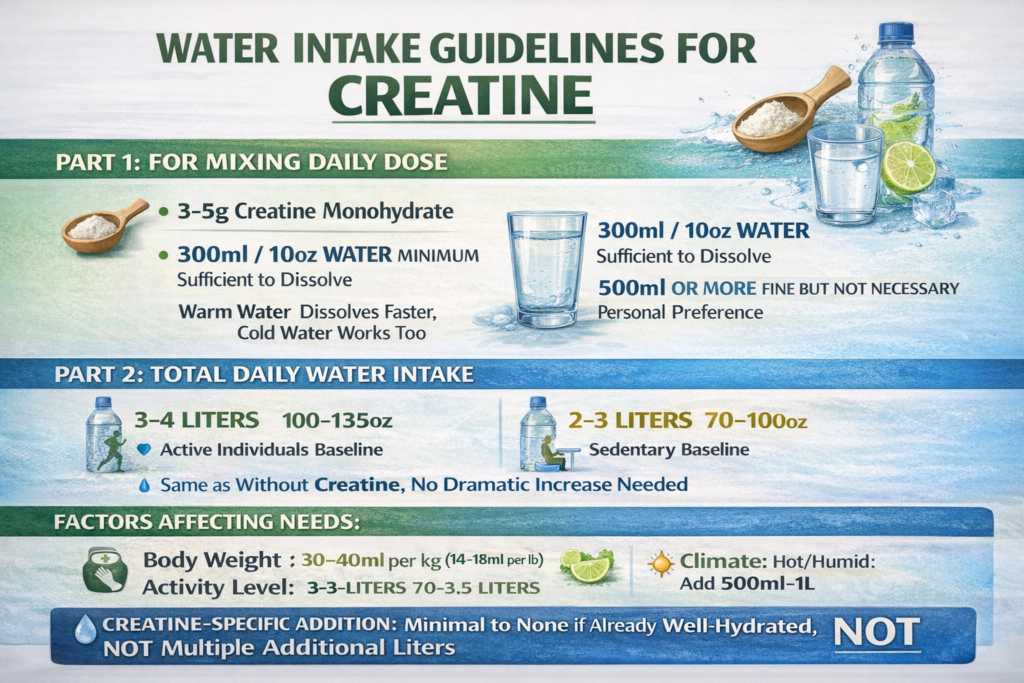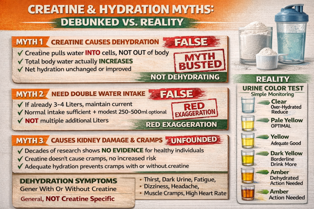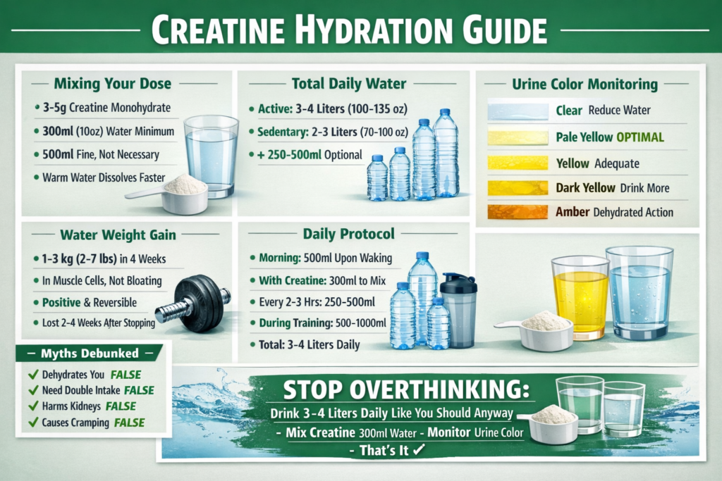 Most of this is wrong or exaggerated. The truth: If you’re already drinking adequate water (3-4 liters daily for active people), you don’t need to dramatically increase intake just because you’re taking creatine. Mix your creatine dose with enough water to dissolve it (300ml works), drink normally throughout the day, and you’re fine. Creatine pulls water INTO muscle cells (intracellular), not OUT of your body. This is different from dehydration.