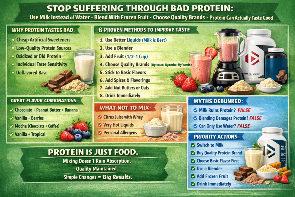 In this comprehensive guide, I’ll reveal 8 proven methods to improve protein taste (simple changes, big impact), explain why some protein tastes bad (quality and sweetener issues), show you what to mix protein with (milk, fruit, and more), address common myths (mixing doesn’t ruin protein), and provide flavor combination ideas (tested recipes that work).
