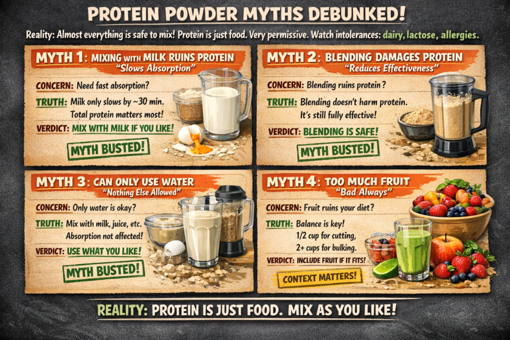 - “Mixing with milk ruins protein” (FALSE, absorption slightly slower but irrelevant)