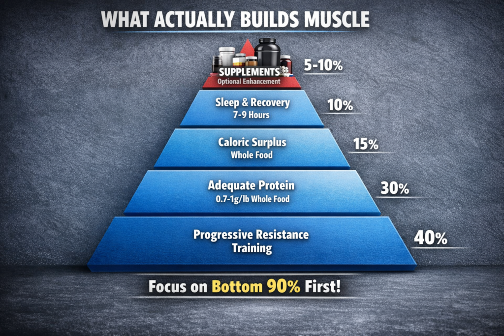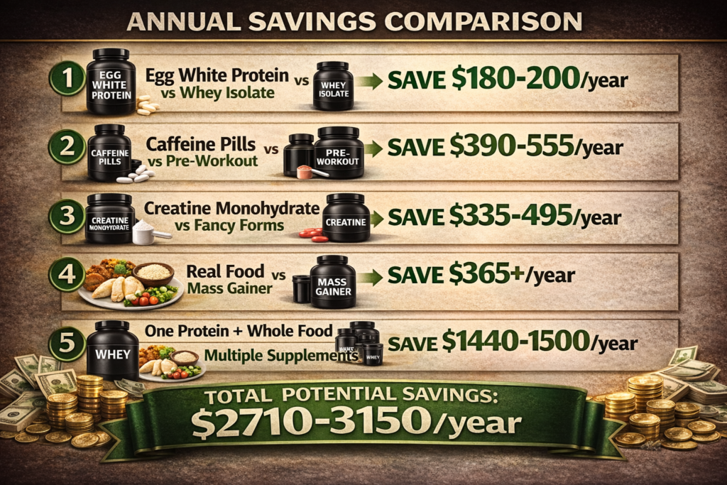 Here’s the uncomfortable truth most supplement companies don’t want you to know: You can build serious muscle spending $20-40 monthly on supplements instead of $200+. The key is understanding that 95% of supplements are unnecessary, whole food nutrition matters far more than any powder, and the few supplements worth buying are cheap and effective.