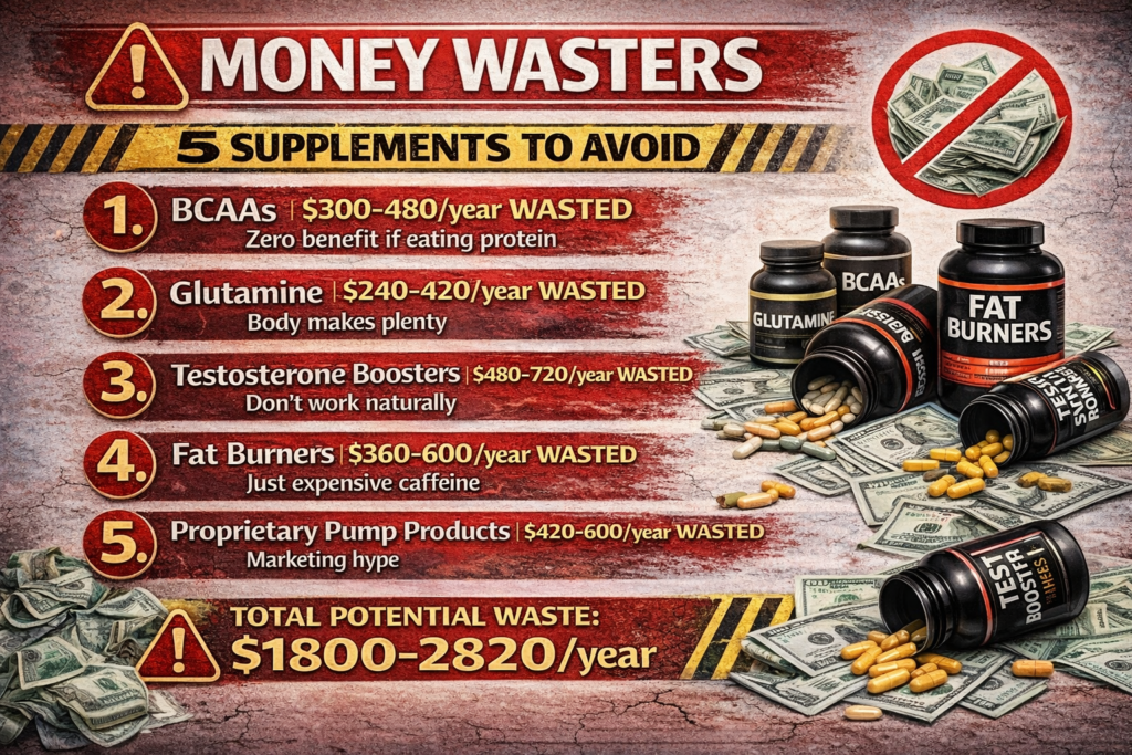 ❌ BCAAs (if eating adequate protein) ❌ Glutamine ❌ Testosterone boosters ❌ Fat burners (unless you just want expensive caffeine) ❌ Fancy creatine forms ❌ Mass gainers (real food is better) ❌ Multiple protein powders ❌ Proprietary blend supplements ❌ Anything with “revolutionary formula”