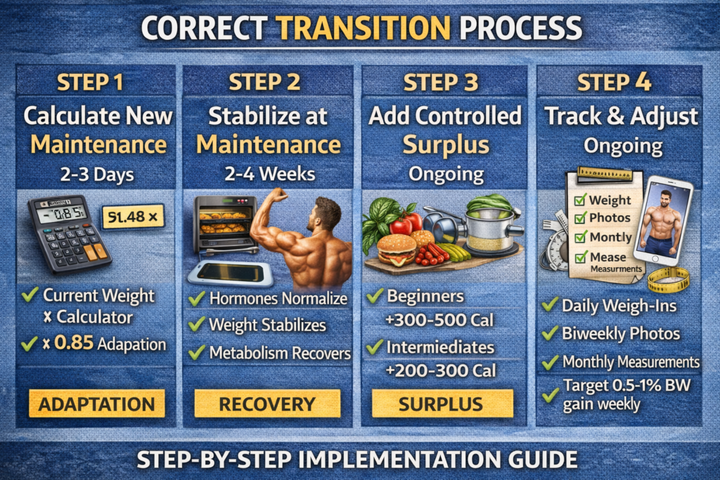 Here’s the truth that will save your hard-earned results: You cannot go from cutting calories directly to bulking calories overnight without gaining excessive fat. Your metabolism has adapted to the deficit, and jumping immediately to a surplus creates the perfect storm for rapid fat regain. The correct approach is to first find your new maintenance calories, stabilize there, then add a controlled surplus.