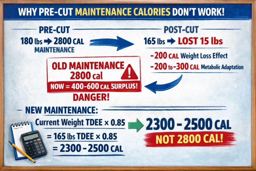 ❌ New maintenance is 400-600 calories lower than pre-cut (weight loss + adaptation)