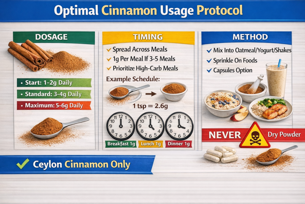 Dosage: 3-5g Ceylon cinnamon daily (start with 1-2g and increase)