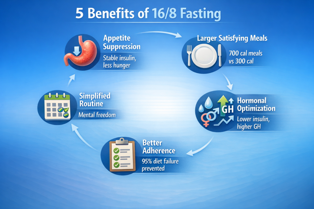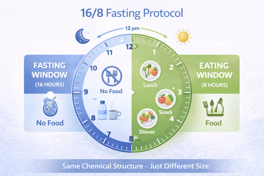 ✅ 16/8 is optimal for body composition: Other fasting protocols (20/4, alternate day, 24-hour) exist but 16/8 provides the best balance for muscle preservation and fat loss.