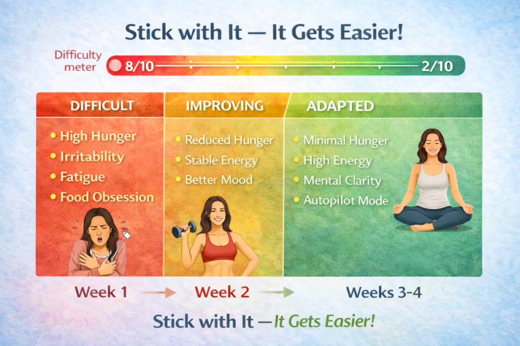What happens: Your body never adapts. Hunger hormones don’t regulate. Feels difficult indefinitely.
