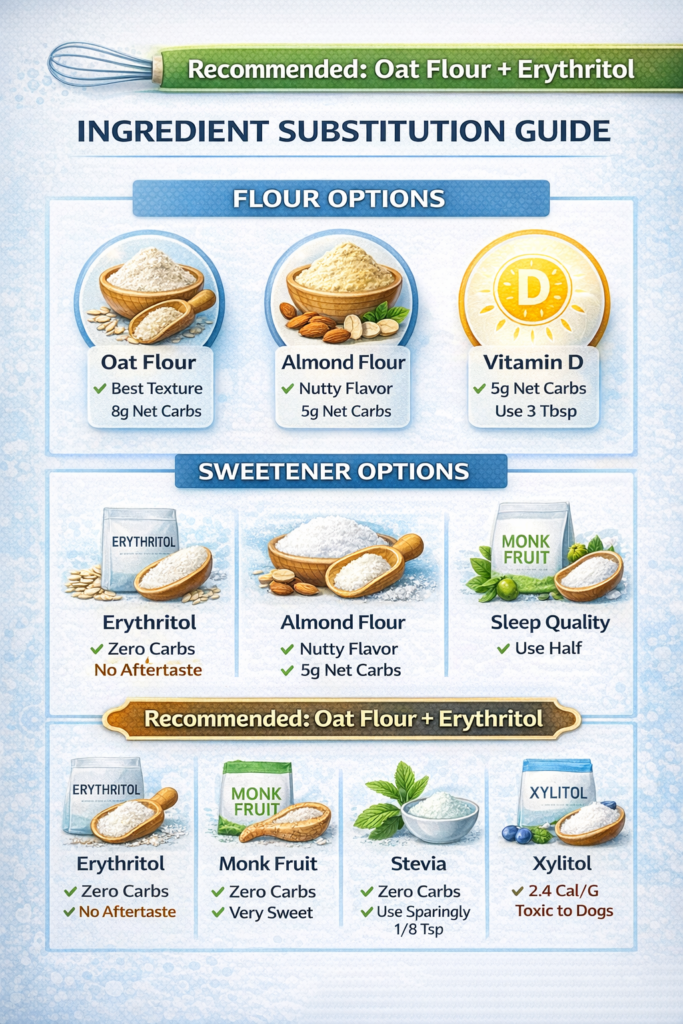 - Oat flour: Best texture, 8g net carbs