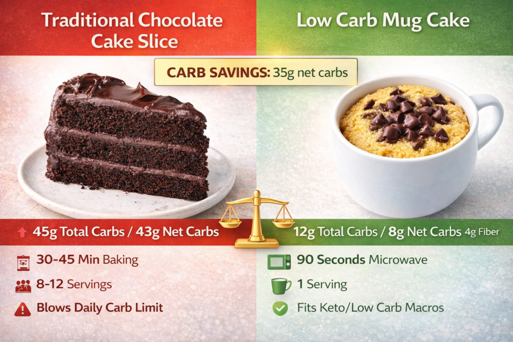 Here’s the perfect solution: This low carb chocolate mug cake contains only 8g net carbs per serving, takes exactly 90 seconds to make in the microwave, uses simple ingredients you already have, tastes like real chocolate cake (not cardboard), and provides complete nutrition information so you can track macros accurately. No flour, no sugar, but all the chocolate satisfaction.