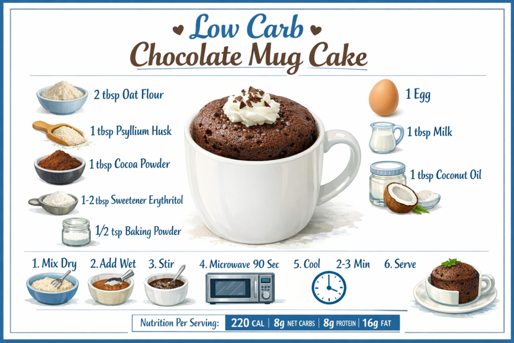 In this comprehensive guide, I’ll provide the complete low carb chocolate mug cake recipe with exact measurements, reveal detailed nutritional information (calories, net carbs, protein, fat), show you ingredient substitutions and variations for different dietary needs, explain the science behind why this recipe works perfectly, and provide troubleshooting tips for common problems (too dry, too rubbery, not rising).