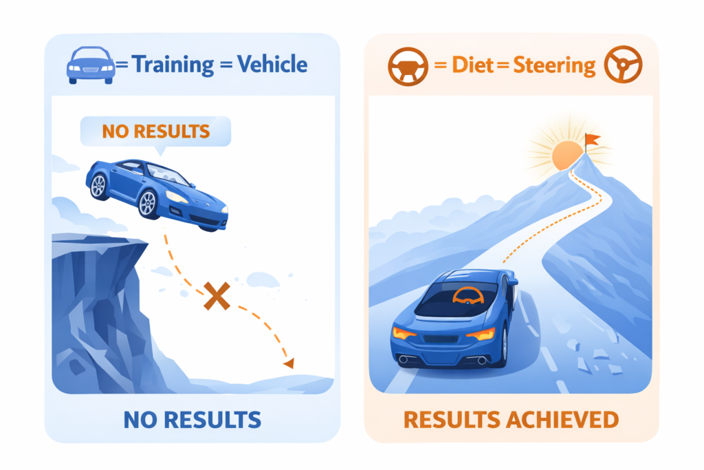Think of training as a vehicle and diet as the steering wheel that controls where that vehicle goes.