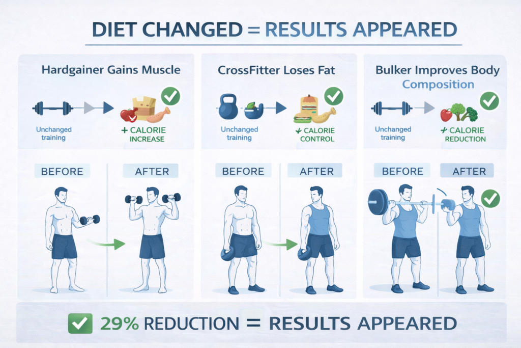 The fix: Reduce to 2,600 calories daily. Increase protein percentage. Reduce junk food justified as “bulking calories.”