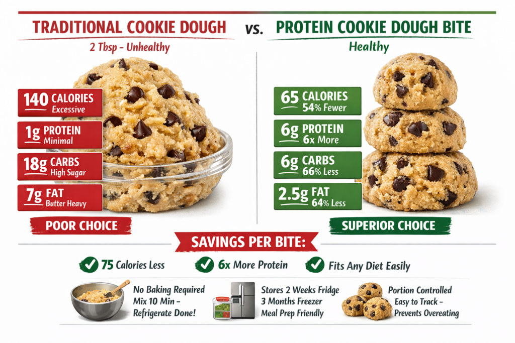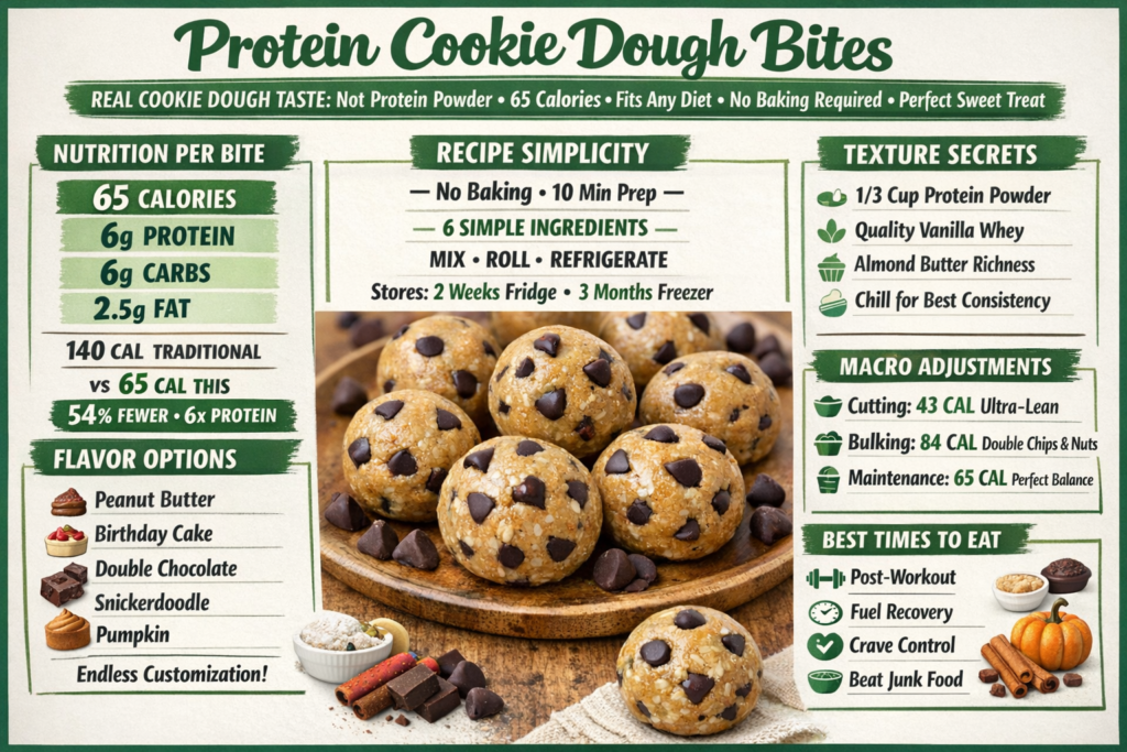 Here’s the complete solution: These protein cookie dough bites contain only 65 calories and 6g protein each, taste exactly like real cookie dough (not protein powder), take 10 minutes to make with no baking required, use only 6 simple ingredients, and can be stored for 2 weeks in the fridge. Perfect for satisfying sweet cravings without derailing your diet.