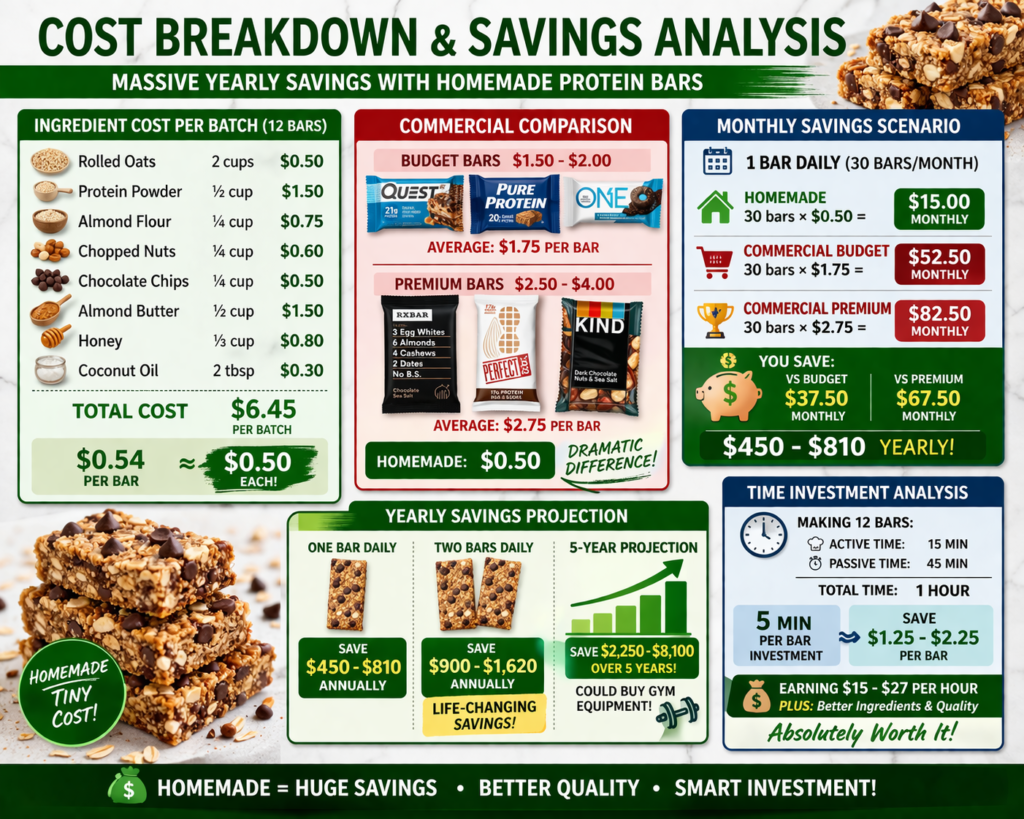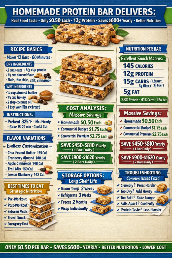 In this comprehensive guide, I’ll provide the complete homemade protein granola bar recipe with exact measurements, reveal the secret binding technique for bars that don’t crumble (perfect texture every time), show you 5 delicious flavor variations (chocolate chip, peanut butter, cranberry almond, apple cinnamon, trail mix), explain macro adjustments for cutting, bulking, or maintenance goals, and provide cost comparison showing you’ll save $600+ yearly making your own.