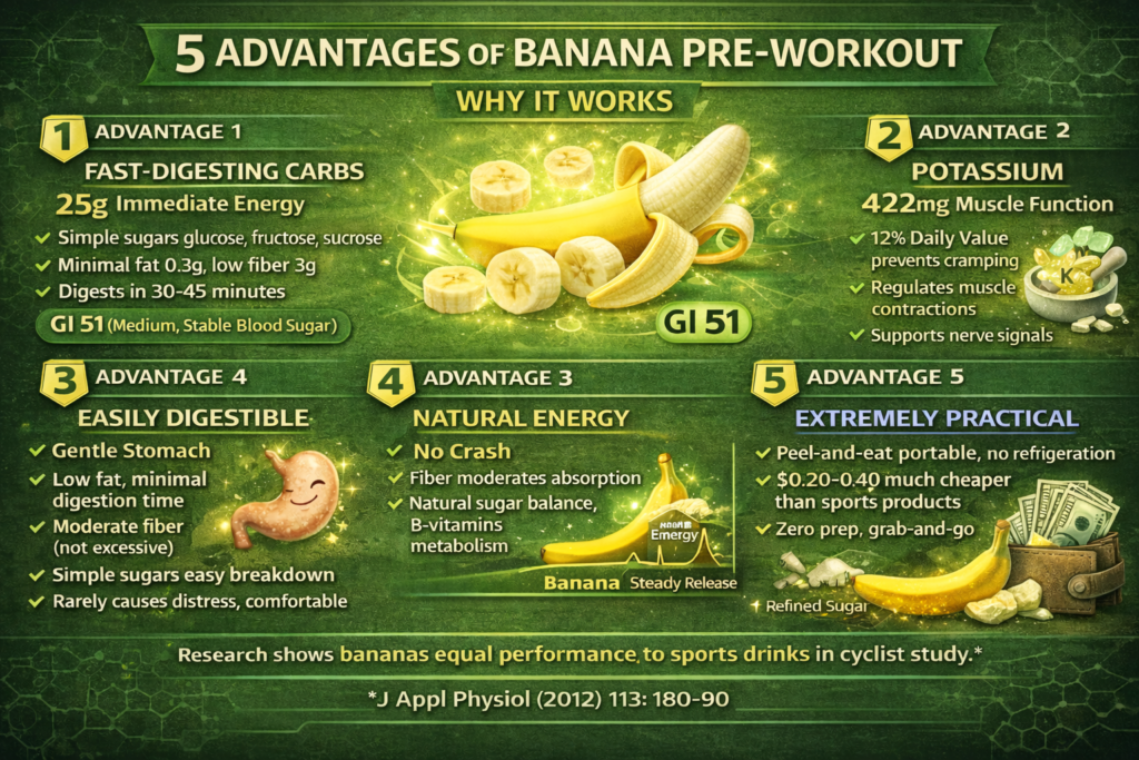 Here’s the evidence-based answer: Yes, bananas are an excellent pre-workout food when eaten 30-60 minutes before training. One medium banana provides 25g of fast-digesting carbohydrates for immediate energy, 422mg of potassium to prevent cramping and support muscle contractions, and natural sugars that provide quick fuel without digestive discomfort. They’re portable, affordable, and scientifically proven to enhance performance.