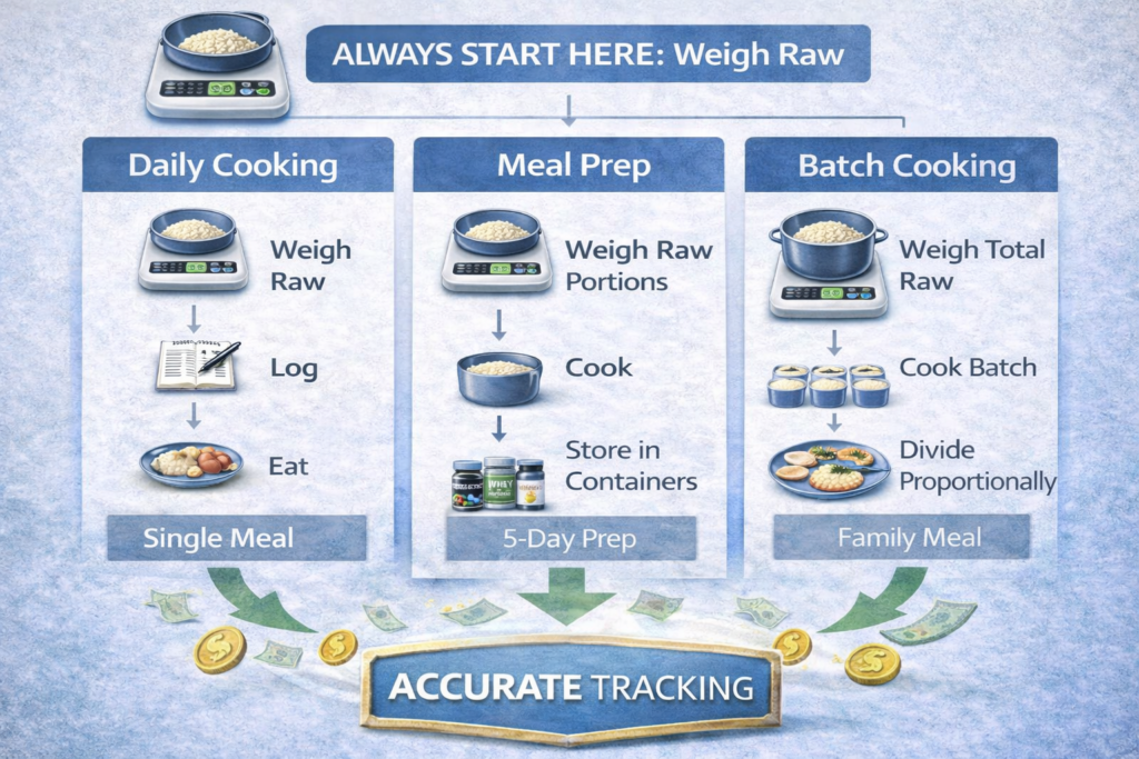 - Weigh total raw → Cook → Divide proportionally → Log raw equivalent