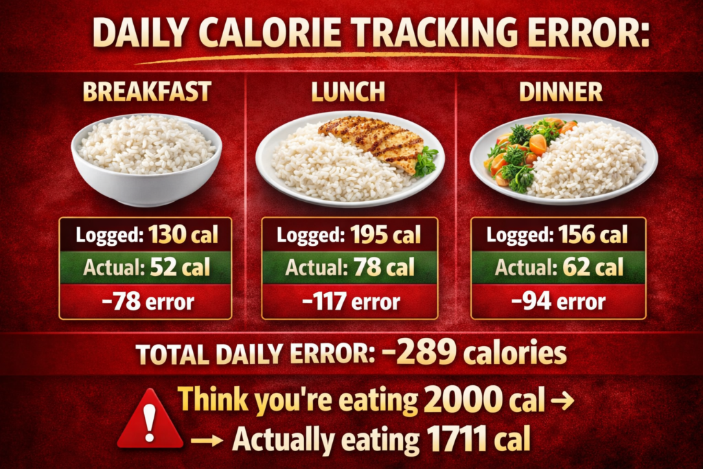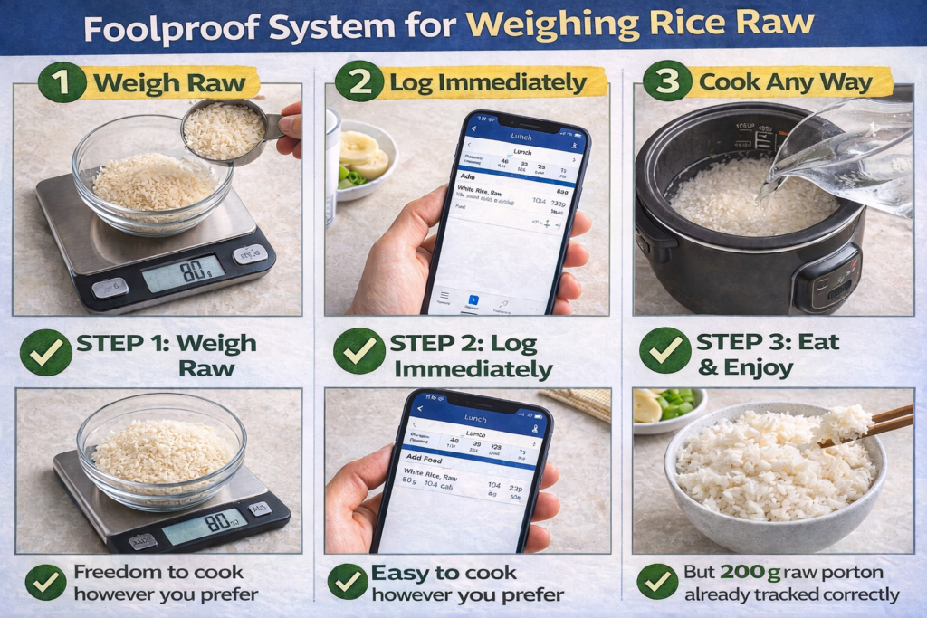 Here’s the truth that will save your diet: You should ALWAYS weigh rice raw (before cooking). Weighing cooked rice creates massive inconsistencies that can throw off your entire diet by hundreds of calories daily.