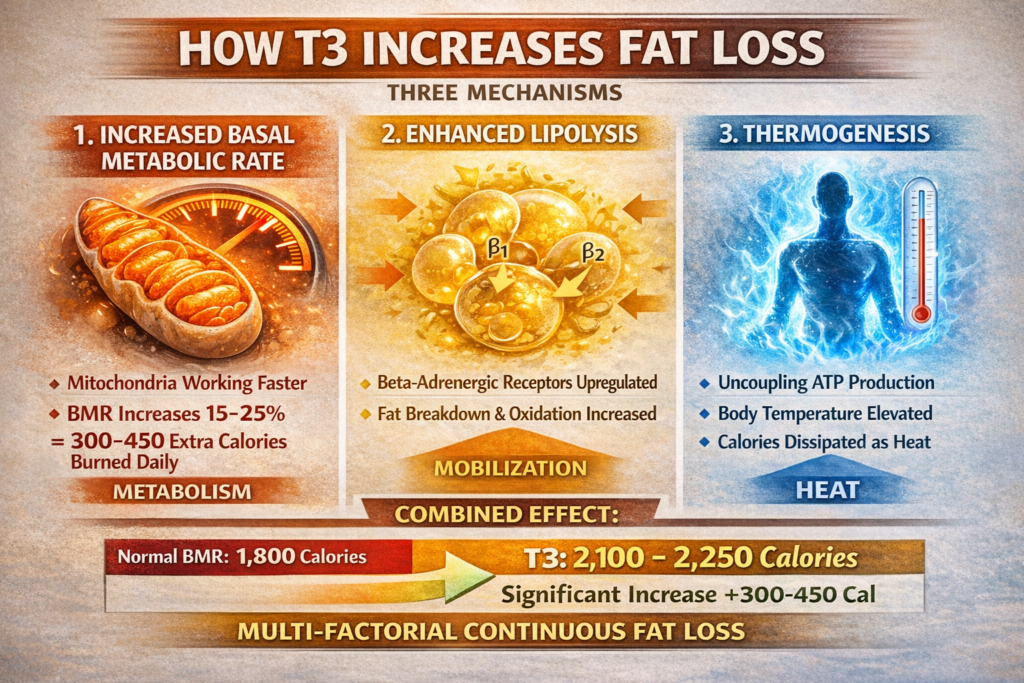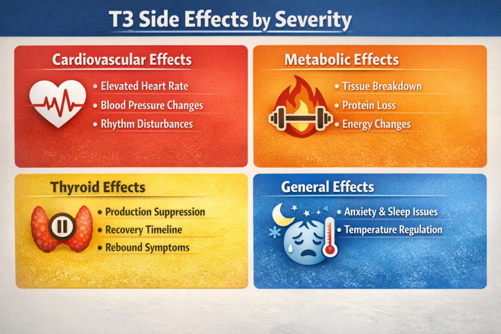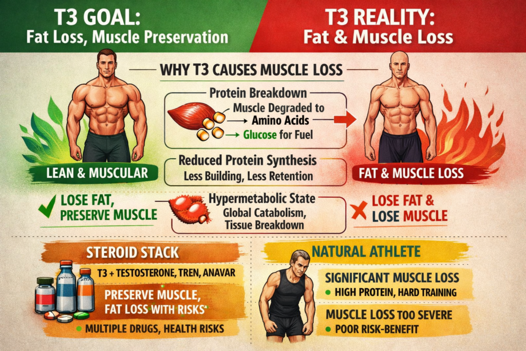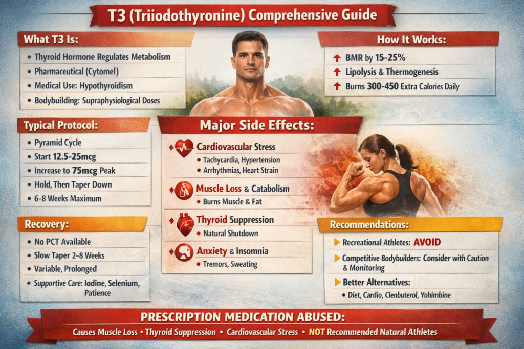 This article is informational only. We do not condone or recommend T3 abuse. T3 is prescription medication for treating hypothyroidism, not for performance enhancement. Using T3 for fat loss causes muscle loss, thyroid suppression, cardiovascular stress, and other serious side effects. If considering any fat loss strategy, consult qualified medical professionals and prioritize safe, sustainable methods.