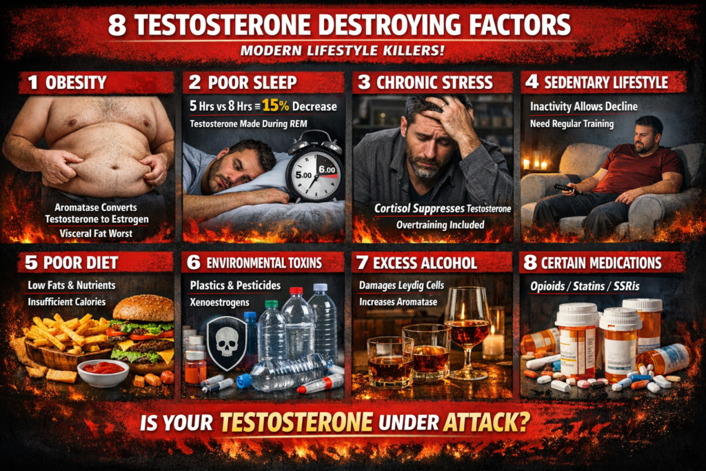 - Poor sleep (<7 hours) (testosterone produced during sleep)