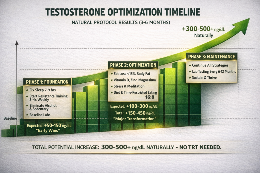 - Week 5-12: Full optimization (all strategies) – Additional 100-300 ng/dL