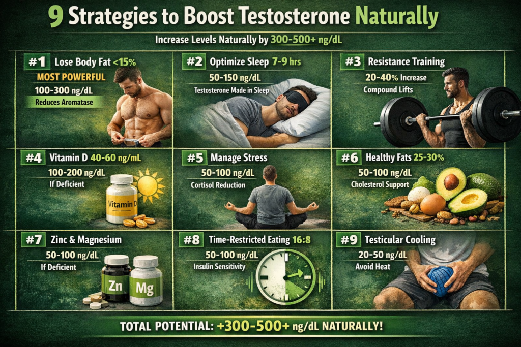 - Lose excess body fat (<15% optimal) – Most powerful, 100-300 ng/dL increase