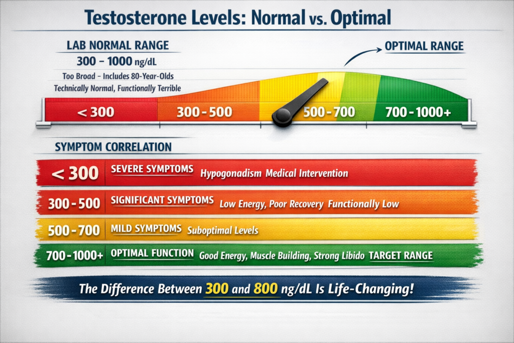 Here’s what’s actually happening: Modern lifestyle systematically destroys testosterone. Poor sleep, chronic stress, obesity, processed foods, sedentary behavior, environmental toxins, and overtraining all crash your levels. Most men are walking around with testosterone 200-400 ng/dL (technically “normal” but functionally low). Optimal is 700-1000+ ng/dL. The difference between 300 and 800 is night and day: energy, strength, muscle mass, fat loss, mood, motivation, and performance all dramatically different.