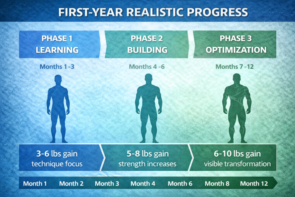 Expected results: Another 6-10 pounds of muscle. Visible physique transformation. Strength at impressive levels for a beginner.