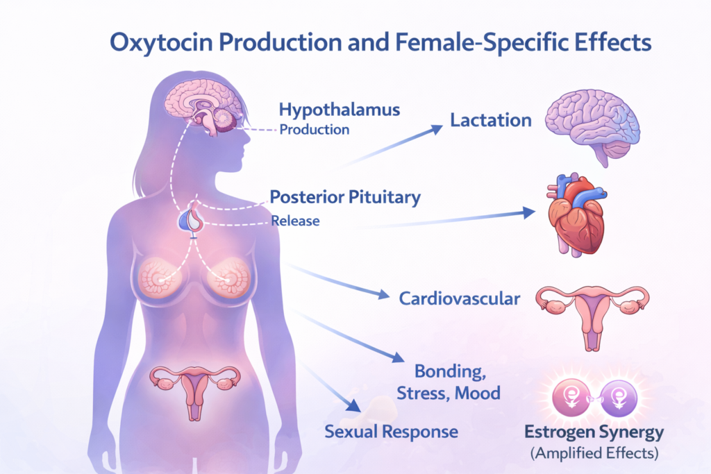 Estrogen synergy: Estrogen increases oxytocin receptor density and sensitivity, creating a powerful interaction unique to women.