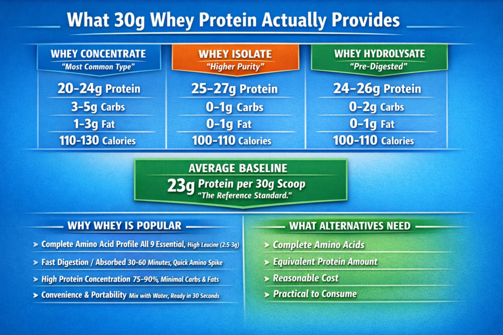In this comprehensive guide, I’ll reveal exactly what 30g of whey protein actually provides nutritionally, show you 7 complete alternatives with precise portions and nutritional breakdowns, explain which alternatives work best for different situations and goals, provide cost comparisons to help you save money without sacrificing results, and clarify why whey protein isn’t mandatory for muscle building despite marketing claims.